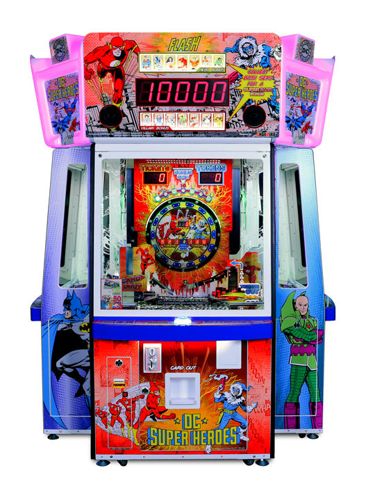 This new highly entertaining DC Superheroes arcade game is a Token + Card Pusher Arcade Game which the players try to press the "shoot" button to rotate the large wheel on the back wall of the cabinet and drop a token through a peg maze. If the player times it just right they can get the token through the "Bonus Drop" area of the maze which will stop the bonus spinner above it which will drop bonus tokens or cards onto the playfield in order for players to collect cards and win tickets!